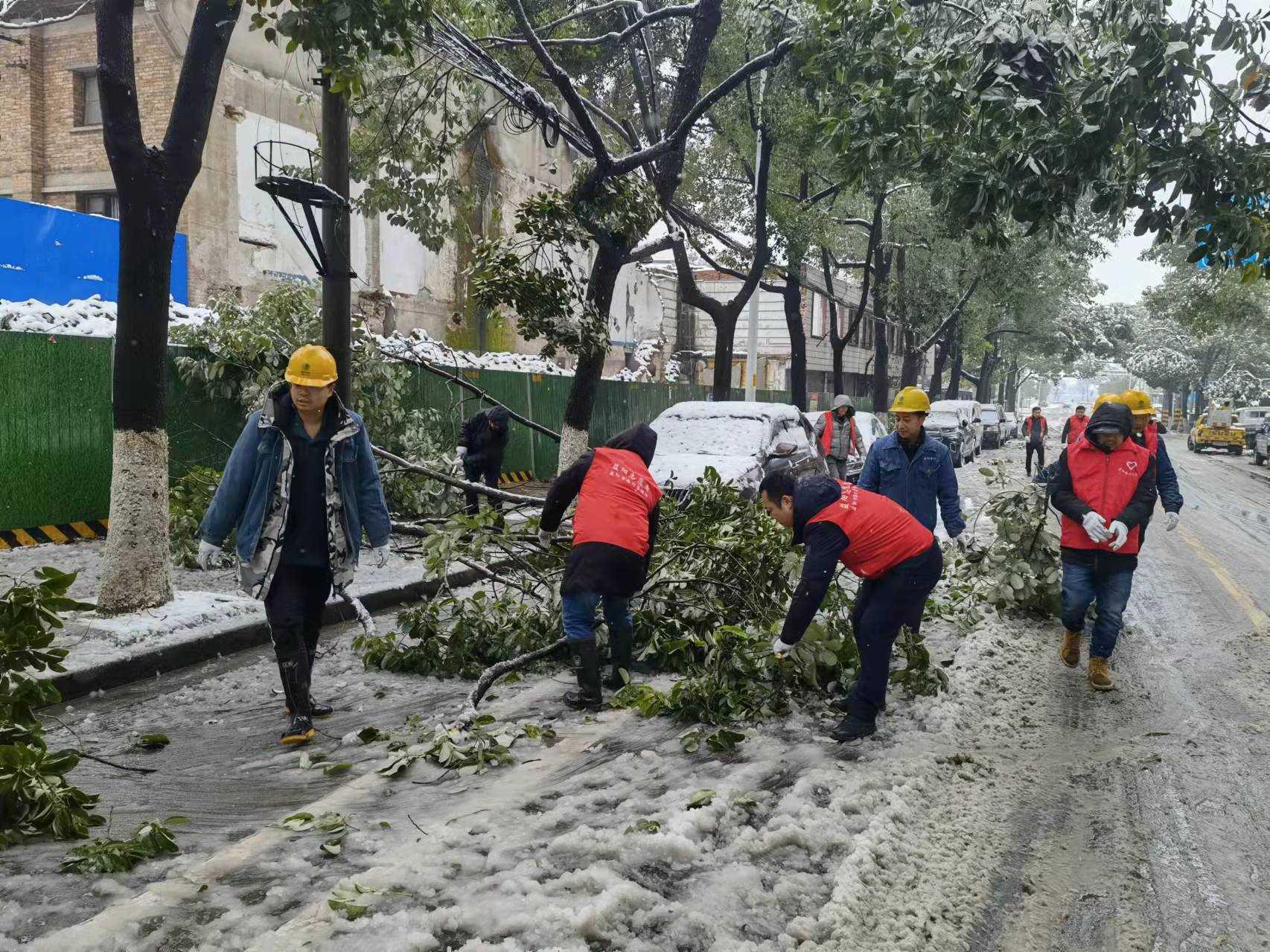 深夜,一場大雪如約而至。積雪不僅壓斷了很多樹枝,還導(dǎo)致市區(qū)道路受阻與濕滑,給行人、車輛出行造成極大不便。為確保惡劣天氣下的道路平安暢通,保護(hù)人民群眾的生命財(cái)產(chǎn)安全,當(dāng)晚,市城管執(zhí)法局組織各片區(qū)大隊(duì)、風(fēng)貌帶大隊(duì)4支應(yīng)急隊(duì)伍上路清理倒伏樹木、鏟除路面積雪,確保主次干道暢通。