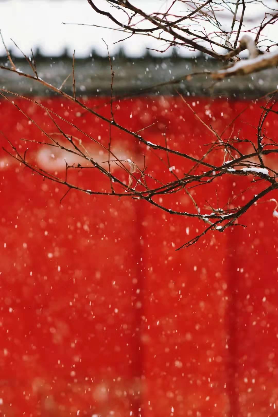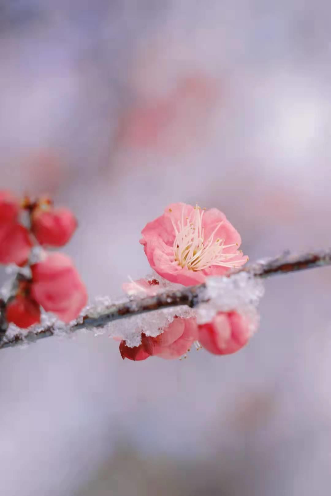 公園里,粉紅色的花瓣、粉黃色的花蕊布滿枝條,有的抽出嫩芽、有的含苞待放,加上亭臺(tái)樓閣的紅墻映襯著皚皚白雪,引得游人紛紛觀賞拍照,爭(zhēng)睹雪中寒梅風(fēng)姿。