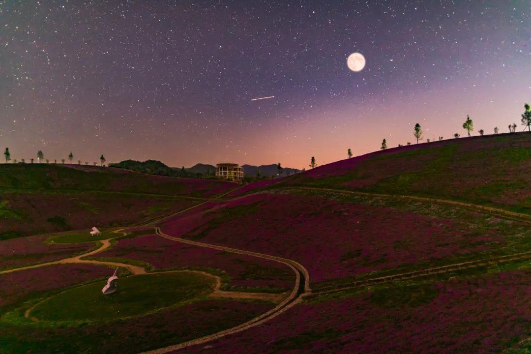 太陽緩緩下沉,落日將天邊映得通紅,最佳賞月時間從傍晚時分就開始了。待余暉落盡,夜幕上升,茶山花海間一輪明月躍出,美得讓人失了言語。