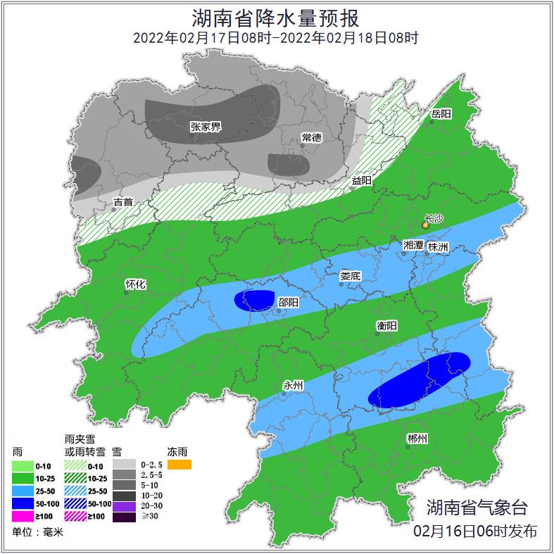 湖南降水量及相態預報(上:2月16日 下:2月17日)