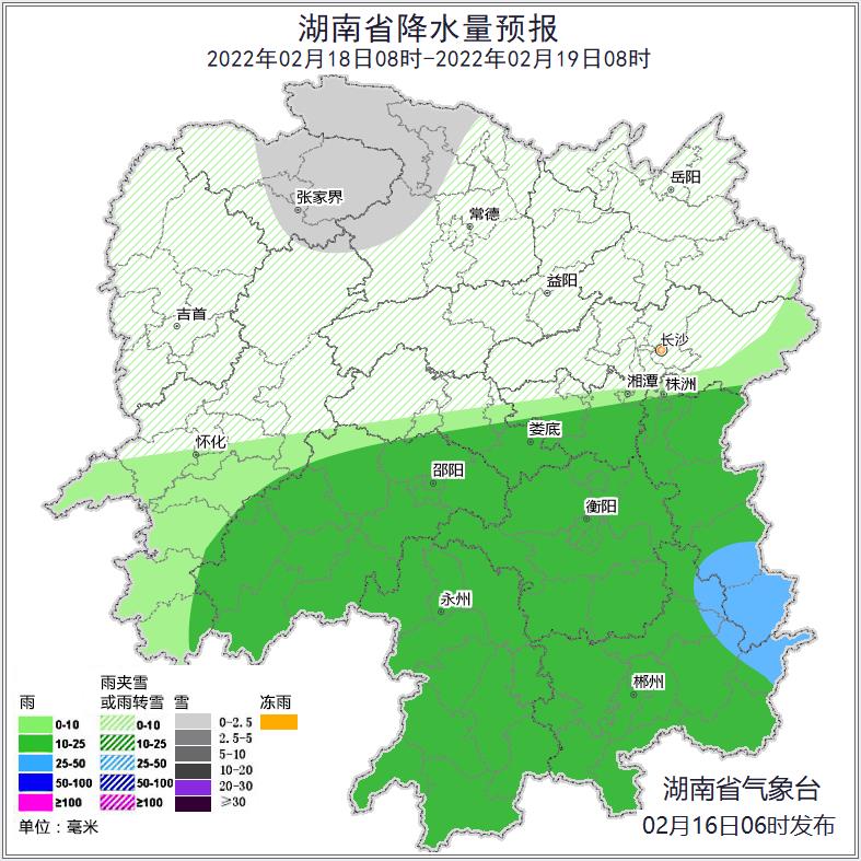 19日,邵陽南部、衡陽南部、株洲南部、永州、郴州陰天有小到中雨,局地大雨,婁底、邵陽北部、長沙南部、湘潭、株洲北部、衡陽北部陰天有雨夾雪或小雪,其他地區雨夾雪轉多云。