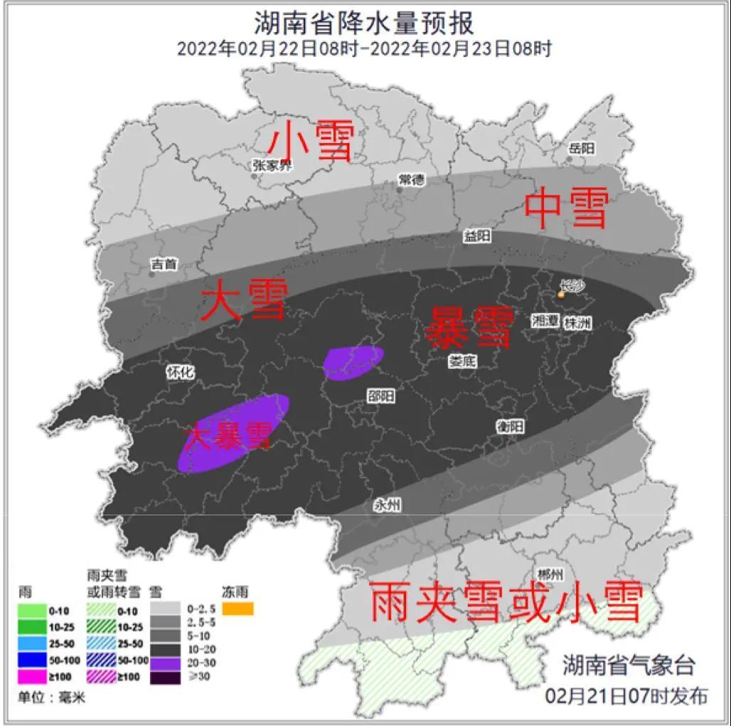 根據最新氣象資料分析,21日晚至22日湘中有暴雪到大暴雪,致災風險高。根據最新氣象資料分析,21日晚至22日湘中有暴雪到大暴雪,致災風險高。根據此情況,2月21日16時,湖南省氣象局提升低溫雨雪冰凍應急響應為三級,強化監測預報預警服務和部門聯防聯動,切實做好氣象保障工作。