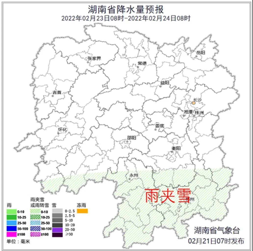 21日,永州、郴州陰天有小雨或雨夾雪,其他地區雨夾雪轉小雪,其中湘西州南部、懷化中北部局地大雪;最低氣溫0~2℃。