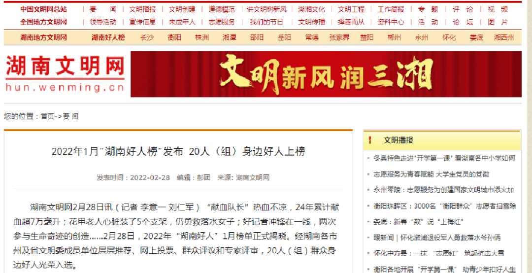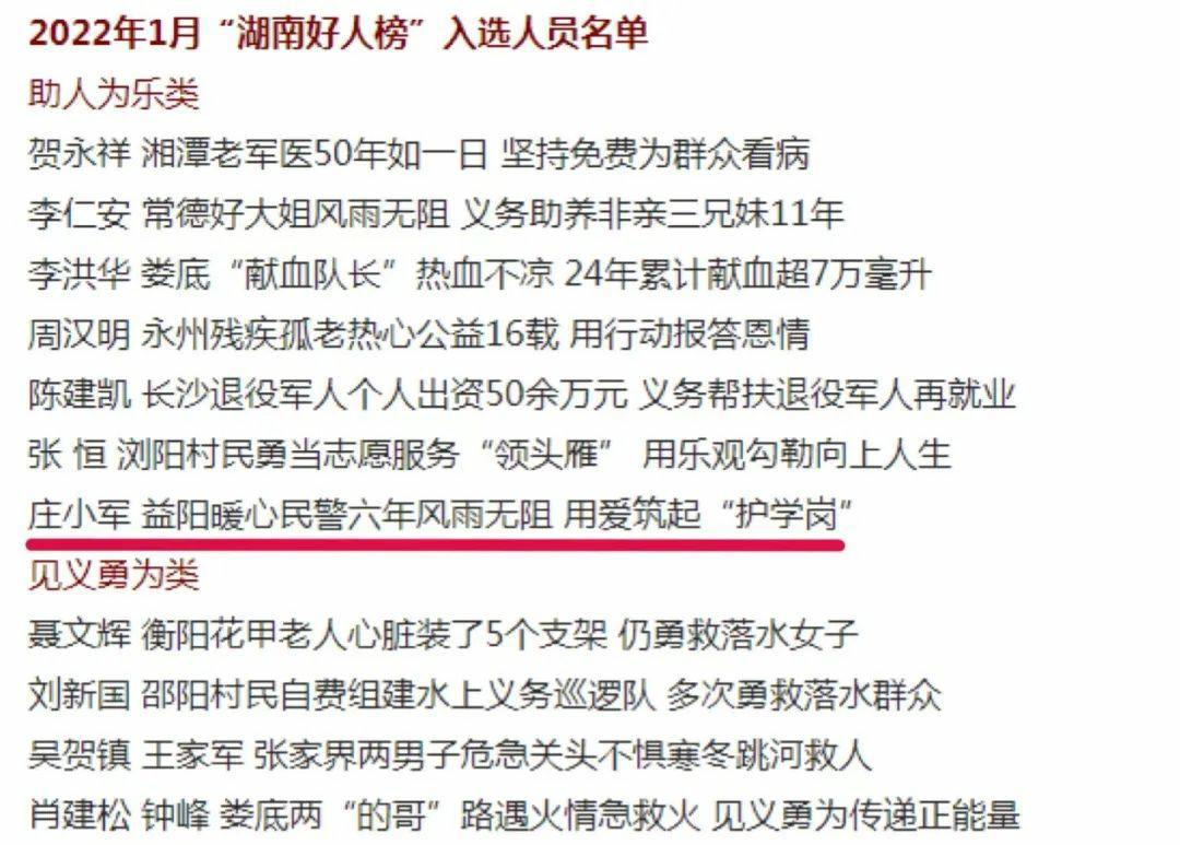 2月28日,湖南省文明辦發布2022年1月“湖南好人榜”,20人(組)群眾身邊好人光榮入選,其中湖南公安系統益陽市公安局交警支隊高新大隊中隊長莊小軍獲評助人為樂類“湖南好人”。
