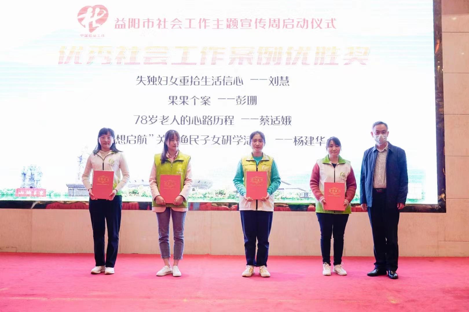 啟動式活動現場,表彰了10名優秀社會工作者和10個優秀社會工作案例。這些優秀代表由益陽市民政局經過推薦、初審、組織專家評審和網絡投票評選,最終評選出。活動現場不僅熱鬧,還充滿了溫情。一位80歲的老人,一名老黨員,一位殘疾孩子的母親,曾經她很迷茫、悲傷,一度陷入極度的痛苦中。在現場她講述了她和社工的故事,告訴我們,在黨和政府的支持下,在社工的關愛下,她獲得了快樂和幸福。