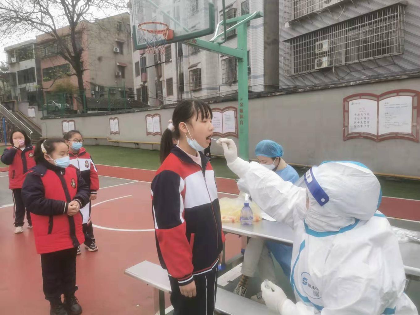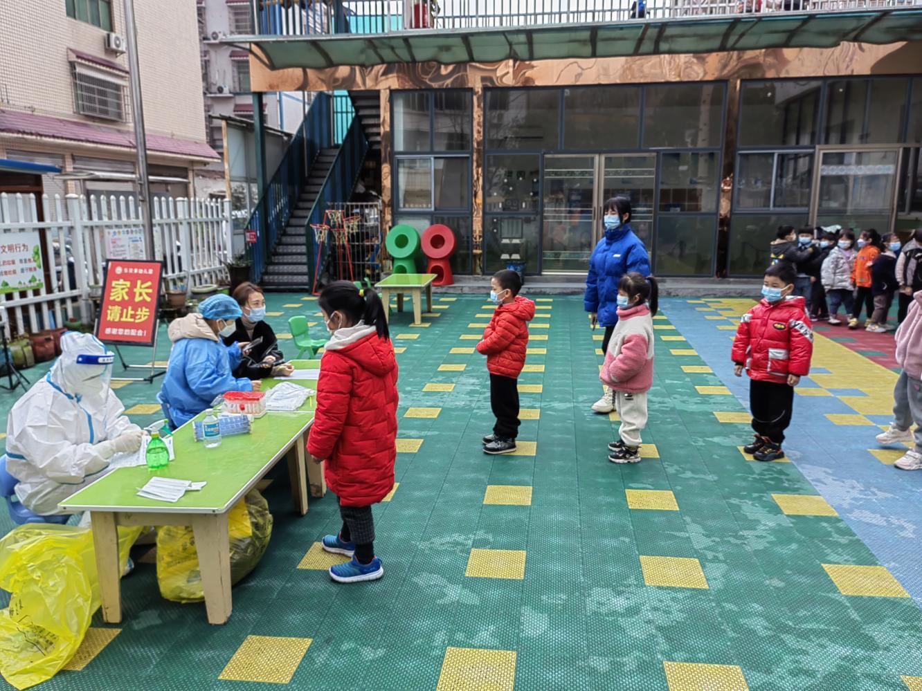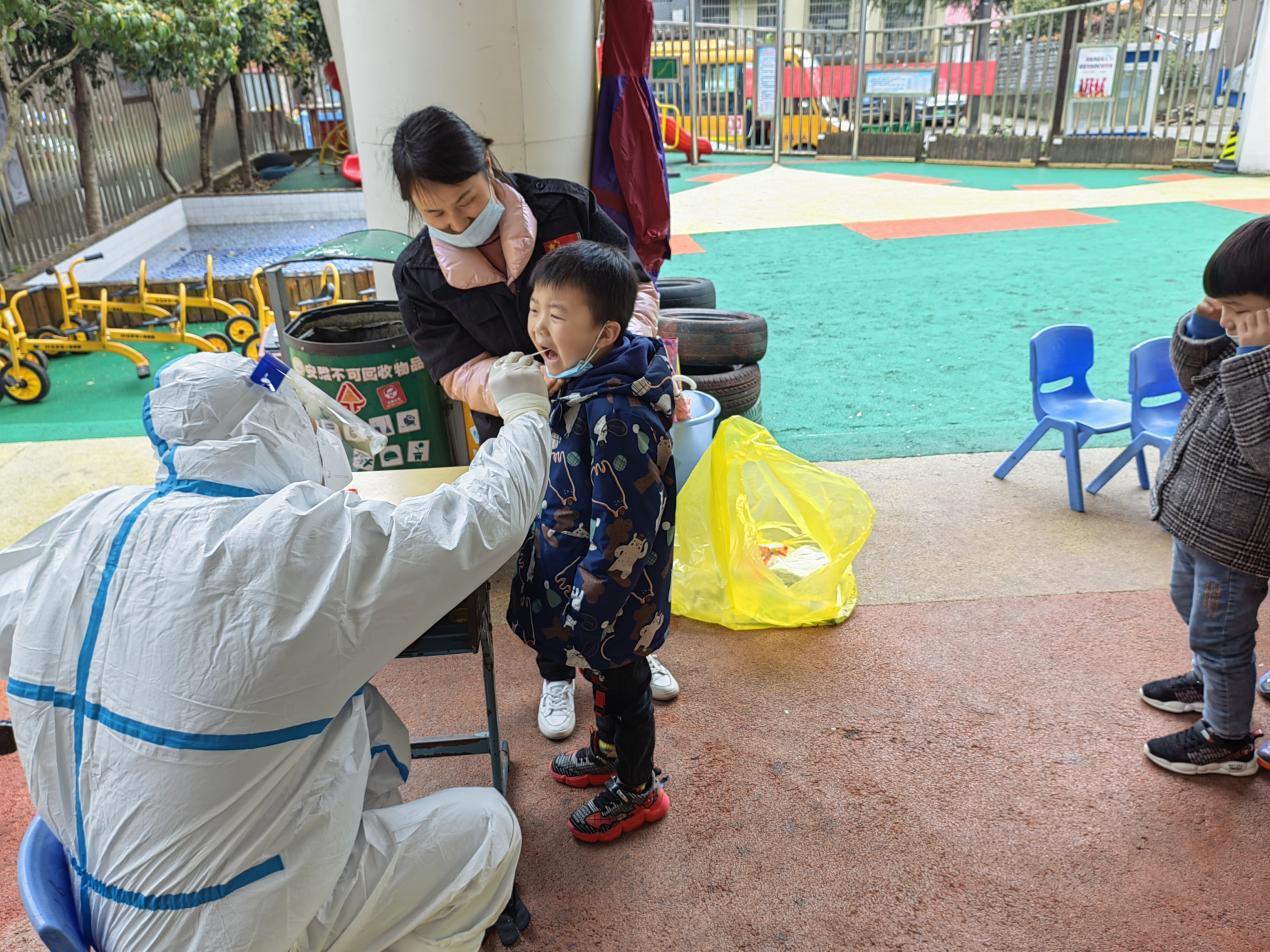 學校總體部署,與當地衛生機構對接安排醫務工作者入校入園分批次進行采樣檢測。各班聽從學校廣播統一安排,由班主任帶隊前往大操場指定小組依次進行核酸抽樣,沒有安排到的班級或是檢測完成的班級按正常秩序上課。上午8:30開始,全體師生、幼兒、員工2000多人次全程佩戴口罩,手持當日健康碼打印件,間隔1米有序排隊進行核酸采樣,上午12:00左右,采樣工作順利結束。