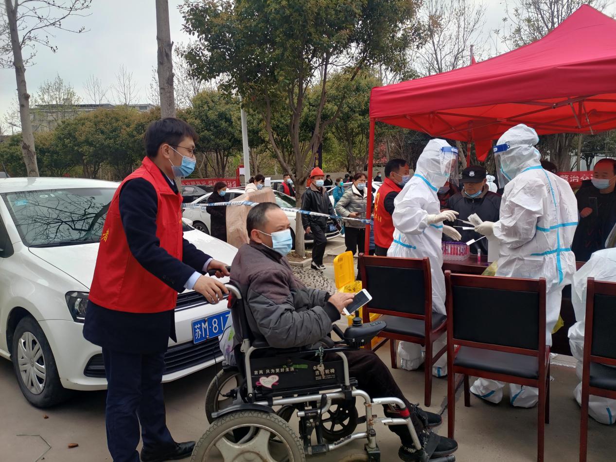 針對居民家中行動不便的老人、殘障人士,街道成立黨員志愿隊上門服務(wù)。用輪椅將老人接到社區(qū)集中點統(tǒng)一采集,志愿隊的黨員用腳丈量距離、用雙手敲開心屝,他們傳遞疫情防控正能量。這群可愛的黨員從這棟樓穿梭到那棟樓,做到核酸檢測不漏一戶,不漏一人。