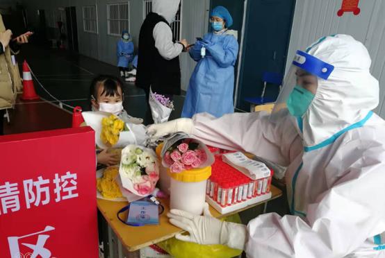“阿姨,辛苦了!”3月25日下午4時許,4歲小朋友小雨在媽媽的指引下,來到南縣東紅社區(qū)五完小疫情防控檢測點,將一束束芳香四溢的鮮花送到正在忙碌的周護士面前表示感謝。面對突然出現(xiàn)在眼前的這一份特殊的禮物,周護士很感動,“真的被你暖到了,小朋友,謝謝你!”小雨媽媽表示,這是她們第三次到這個點參加核酸檢測,這兩天南縣天氣不好,感覺醫(yī)生和志愿者們不容易,很辛苦,于是便發(fā)生了這暖心的一幕。