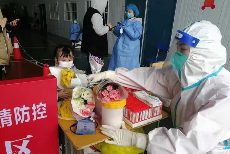 “阿姨,您辛苦了!”3月25日,4歲萌娃小雨在媽媽的指引下,來到南縣東紅社區五完小核酸檢測點。一束束暖心的鮮花,讓在場醫護人員的心逐漸融化,天雖寒,心卻暖。