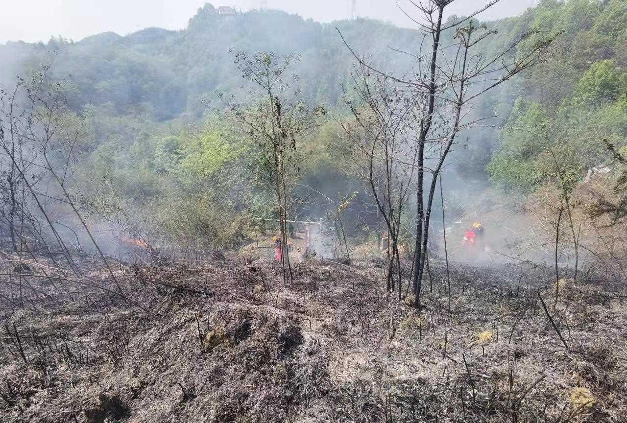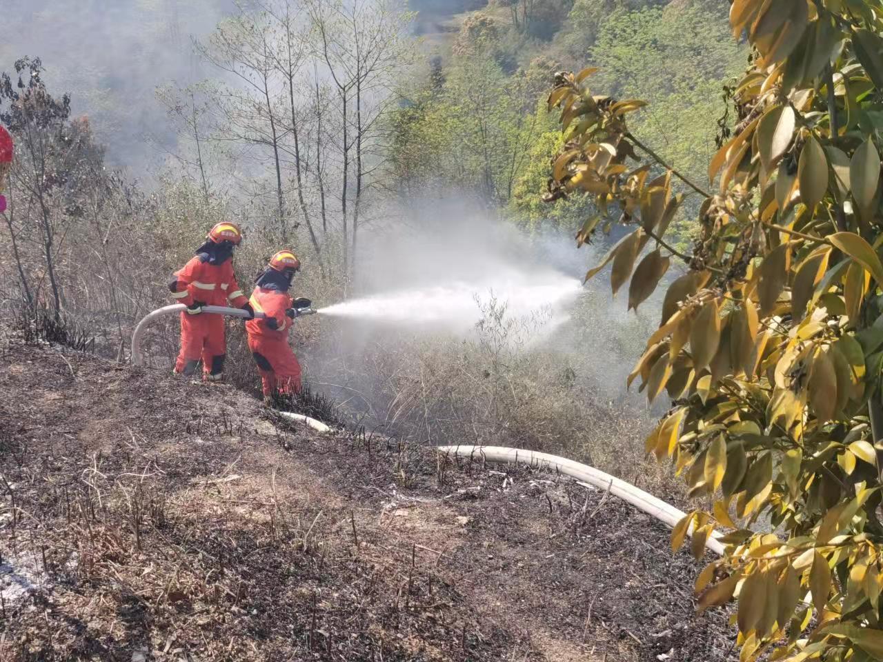 無獨有偶,消防救援人員還在歸隊的路上,又接到報警,稱新橋河鎮黃龍山村發現山火,消防救援人員馬不停蹄立即趕往現場進行處置。14分時25分消防救援人員到達現場,發現山坡上草坪燒毀嚴重,火苗和濃煙不斷竄出,火勢呈蔓延趨勢,附近居民正在自發組織滅火。多虧現場道路相對平坦,消防車能迅速到達起火點附近,消防救援人員立即兵分多路,一邊在周邊打水阻止火勢蔓延,一邊快速鋪設水槍水帶控制明火,約1個小時左右,山火被完全撲滅。