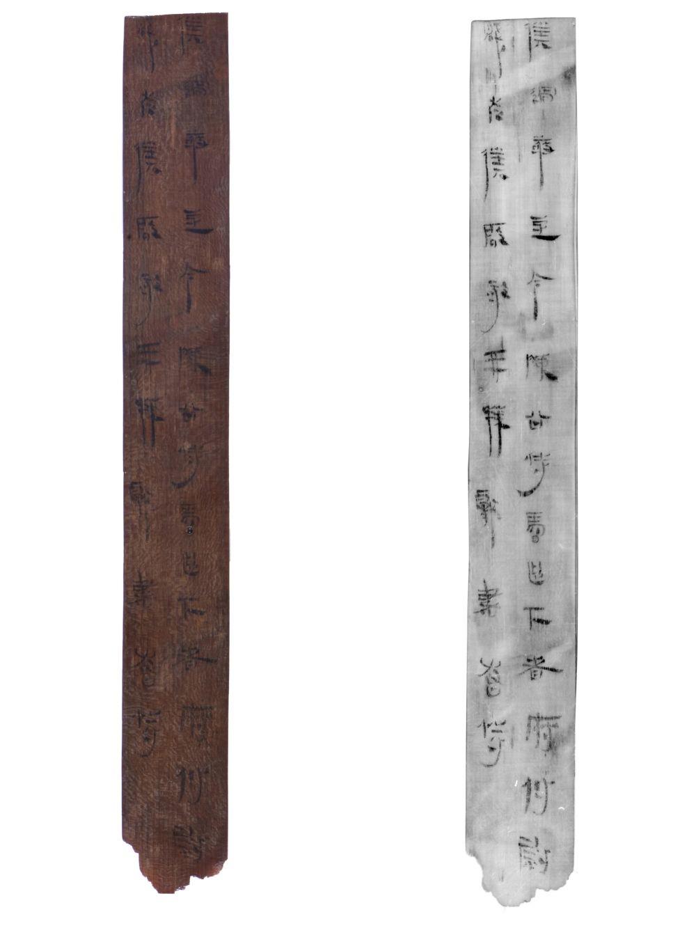這是湖南益陽(yáng)兔子山遺址出土的一枚西漢“獻(xiàn)書(shū)簡(jiǎn)”。左為簡(jiǎn)牘圖片,右為其紅外掃描件。(湖南省文物考古研究所供圖)