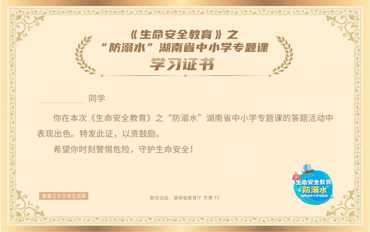 五一假期之后即將立夏,天氣逐漸炎熱,溺水將進入高發季。涼爽的河流和小溪給同學們帶來了很多的快樂,但同時也潛藏著安全的危機。《生命安全教育之“防溺水”湖南省中小學專題課》五一假期正式上線,并號召學校利用班會、家長會、課后服務等時機,以及在端午、暑假、國慶等重要節點反復組織學生及家長觀看,幫助學生熟知防溺水“七不兩會”安全知識。每集專題課還設置在線互動活動,鞏固安全教育知識,學生和家長可通過掃描活動二維碼參與互動,完成全部活動后可獲取《綜合實踐活動證書》。