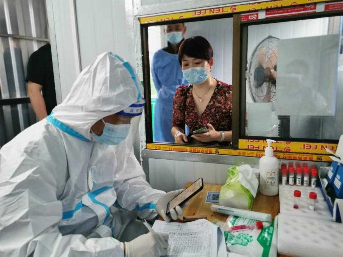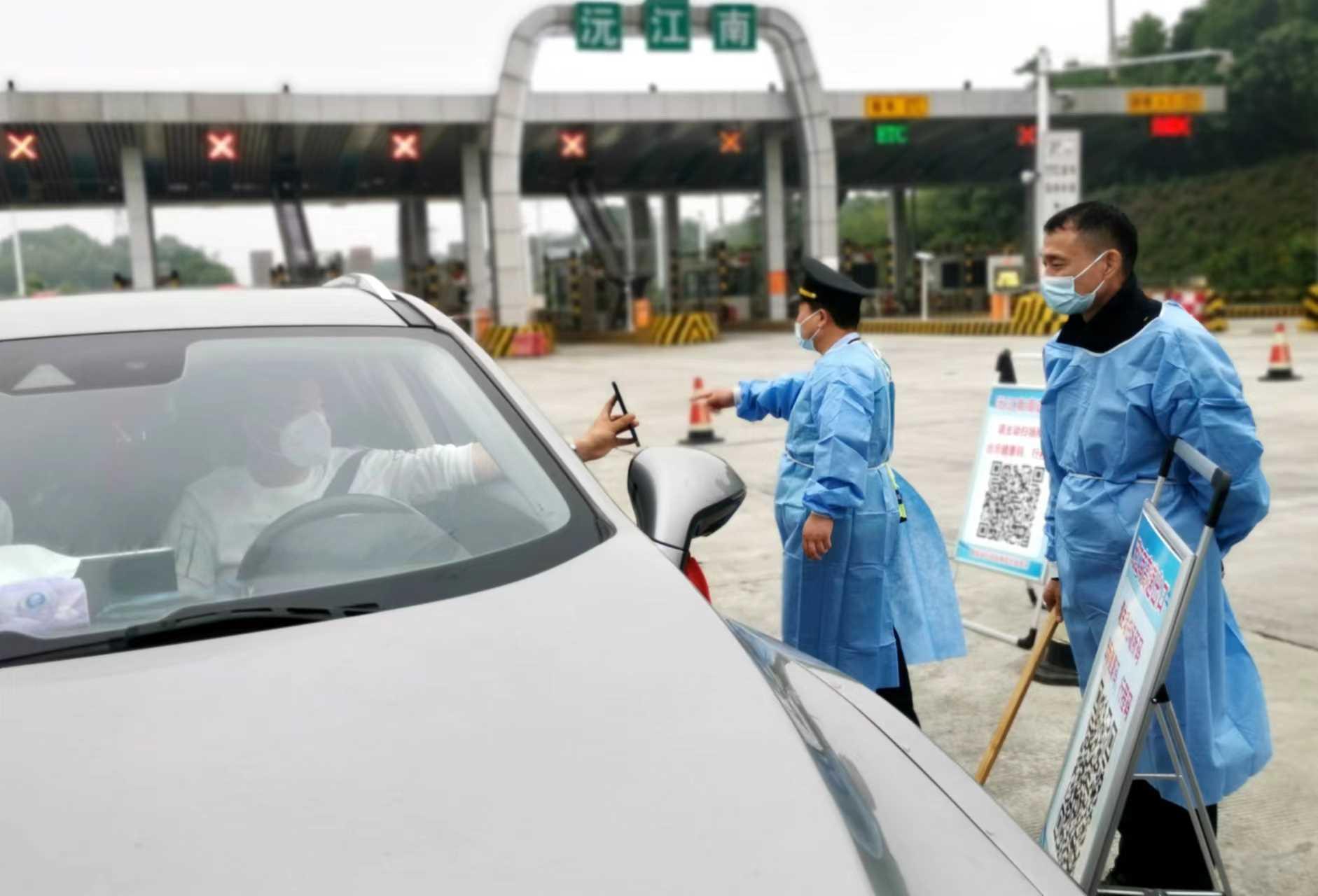 5月8日,在沅江南高速出口疫情防控服務站,幾名交通執法人員穿著厚厚的防護服,對過往車輛駕乘人員進行檢查,引導相關人員進行信息登記,協助醫務人員進行核酸檢查,這是他們堅守在這里的第50個晝夜。