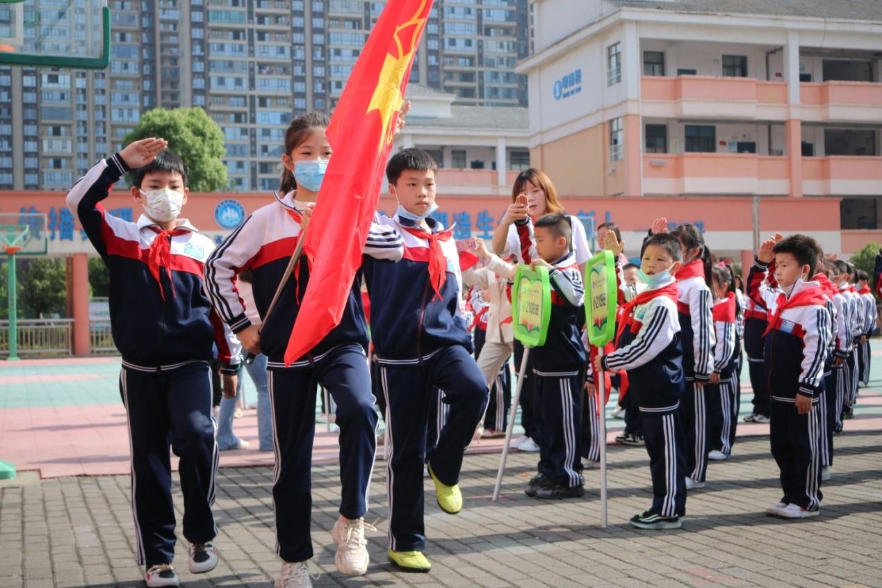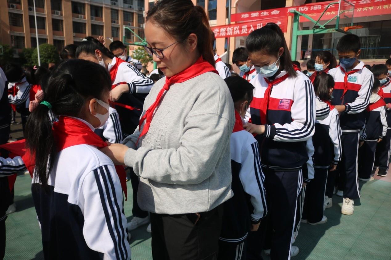 當日上午八點整,少先隊旗手踏著激昂地少先隊出旗曲,邁著整齊的步伐進入會場,隊旗飄揚,全體隊員和老師高唱《我們是共產主義接班人》,嘹亮的歌聲在會場回響,激蕩人心。大隊輔導員龍沛宣布新隊員名單,一年級來自20個班的300名學生正式成為光榮的中國少年先鋒隊隊員,六年級同學們為新隊員授紅領巾,當一條條象征著國旗一角的紅領巾在新隊員胸前飄起來時,孩子們的臉上洋溢著激動與自豪。大隊委員帶領新隊員在隊旗下莊嚴宣誓,新老隊員發言用稚嫩、鏗鏘的話語,表達了他們內心的自豪和為紅領巾增光添彩的決心。學校德育副校長夏宏國深情寄語新隊員,他希望新隊員們要志存高遠、信念堅定、勤奮學習、勇于創造、品德優良、向上向善。隨后,大隊輔導員龍沛帶領新隊員們呼號,在“時刻準備著”的呼號聲中,更堅定了他們的決心和行動,努力成長為擔當民族復興大任的時代新人,做共產主義事業的接班人。