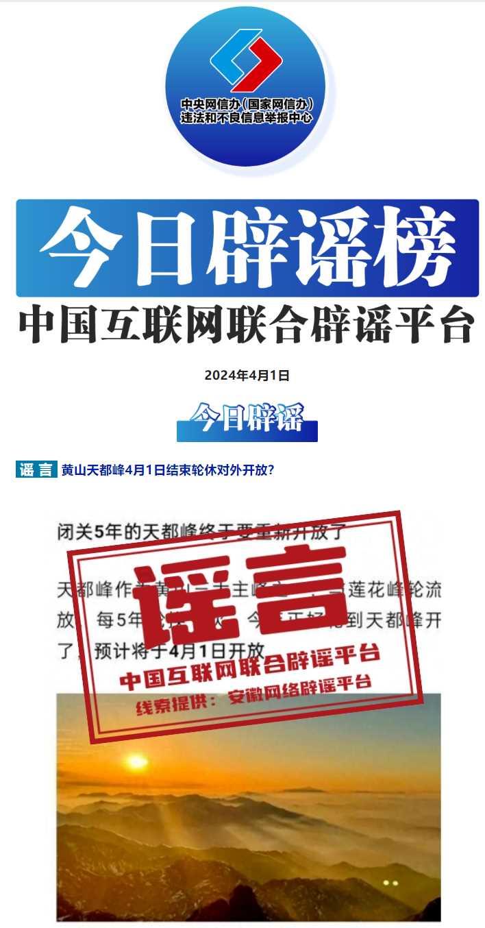真相:近期,有網絡平臺賬號發布信息稱“黃山天都峰將于4月1日開放”。對此,黃山風景區管理委員會官方微信“中國黃山”發文表示,“景區尚未明確開放天都峰的具體時間,相關工作還在開展過程中”。據了解,黃山風景區管理部門對景區內高海拔景點實行定期封閉輪休,在封閉期間,游人禁止進入,以人工輔助自然恢復的方式,促進樹木、林下植被生長,以期生態環境得以改善。天都峰目前仍在封閉狀態,其對外開放須經多方評估,確保達到預期的輪休效果,并對區域內的基礎設施予以維護提升,待自然環境、安全保障等符合開放條件后,再確定具體的開放時間。天都峰開放日期一旦確定,黃山風景區將會提前向社會公布,敬請游客朋友們關注官宣。(來源:安徽省互聯網違法和不良信息舉報中心、“中國黃山”微信公眾號)